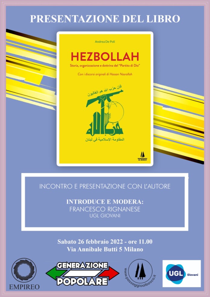 Al centro dell’incontro il volume “Hezbollah” (174 pp., 13€), edito da Passaggio al Bosco nel 2021, di Andrea De Poli, presente all’evento. Uno studio importante – arricchito dalla traduzione inedita dei discorsi di Hassan Nasrallah e da un’appendice fotografica – che punta i riflettori su uno dei più controversi e celebri attori politici del difficile teatro medio-orientale.