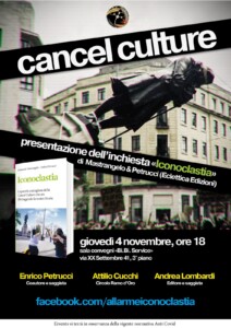 Giovedì 4 novembre 2021 alle ore 18 a Genova, presso la sala convegni Bi.Bi. Service in via XX Settembre 41, 3° piano, presentazione del libro-inchiesta: Iconoclastia. La pazzia contagiosa della Cancel Culture che sta distruggendo la nostra storia, di Emanuele Mastrangelo e Enrico Petrucci (Eclettica Edizioni).