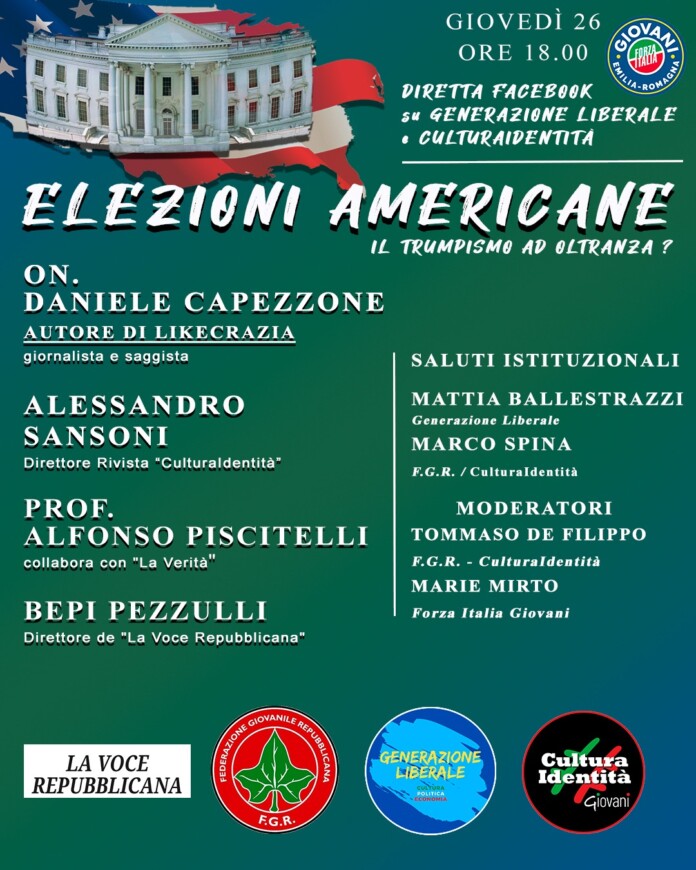 I Giovani dell’associazione “CulturaIdentità”, insieme alla Federazione Giovanile Repubblicana e al think-thank di “Generazione Liberale” hanno organizzato per la giornata di Giovedì 26 novembre alle ore 18.00 un incontro via streaming, con illustri ospiti, per affrontare meglio il tema delle elezioni americane. Daniele Capezzone, Alessandro Sansoni, Alfonso Piscitelli e Bepi Pezzulli, introdotti e moderati da Tommaso Alessandro De Filippo e Marie Mirto, ci delucideranno sull’attuale situazione di scontro (non ancora risolta) che vede contrapporsi i due candidati per il ruolo di POTUS. Pertanto, vi invitiamo a seguire la nostra manifestazione che sarà trasmessa dalle ore 18.00 sulla pagina di Facebook di “CulturaIdentità”.