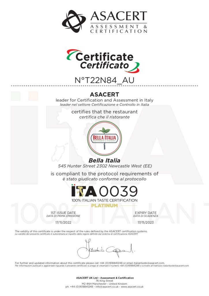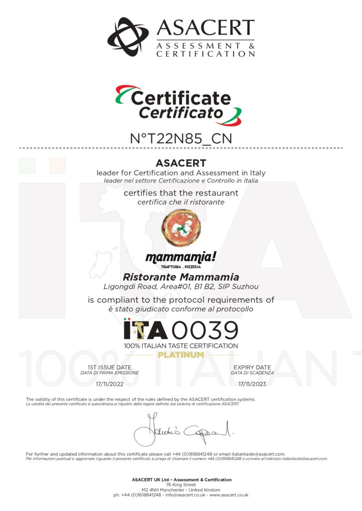 Si è da poco conclusa la settimana edizione della cucina italiana del mondo 2022. ITA0039, prima certificazione al mondo per la tutela del vero Made in Italy per la ristorazione italiana all’estero, l’ha celebrata certificando due nuovi ristoranti in Cina e in Australia. Entrambi con rating Platinum, il massimo del punteggio ottenibile, in base ai parametri della check-list elaborati dall’ente di certificazione Asacert ed ottenuto in seguito ad un audit di verifica.