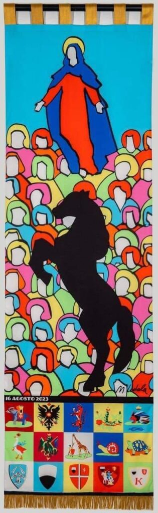 Nella parte alta raffigura la Madonna (il Palio di Siena è in onore della Madonna Assunta) con una veste rossa e un mantello blu, il volto non delineato, come in tutti i lavori che contraddistinguono il Maestro: quelli di Lodola sono volti senza tempo e la stessa cifra stilistica si ripropone in quest’opera che, come il Palio stesso, contamina sacro e profano, tradizione e modernità.