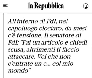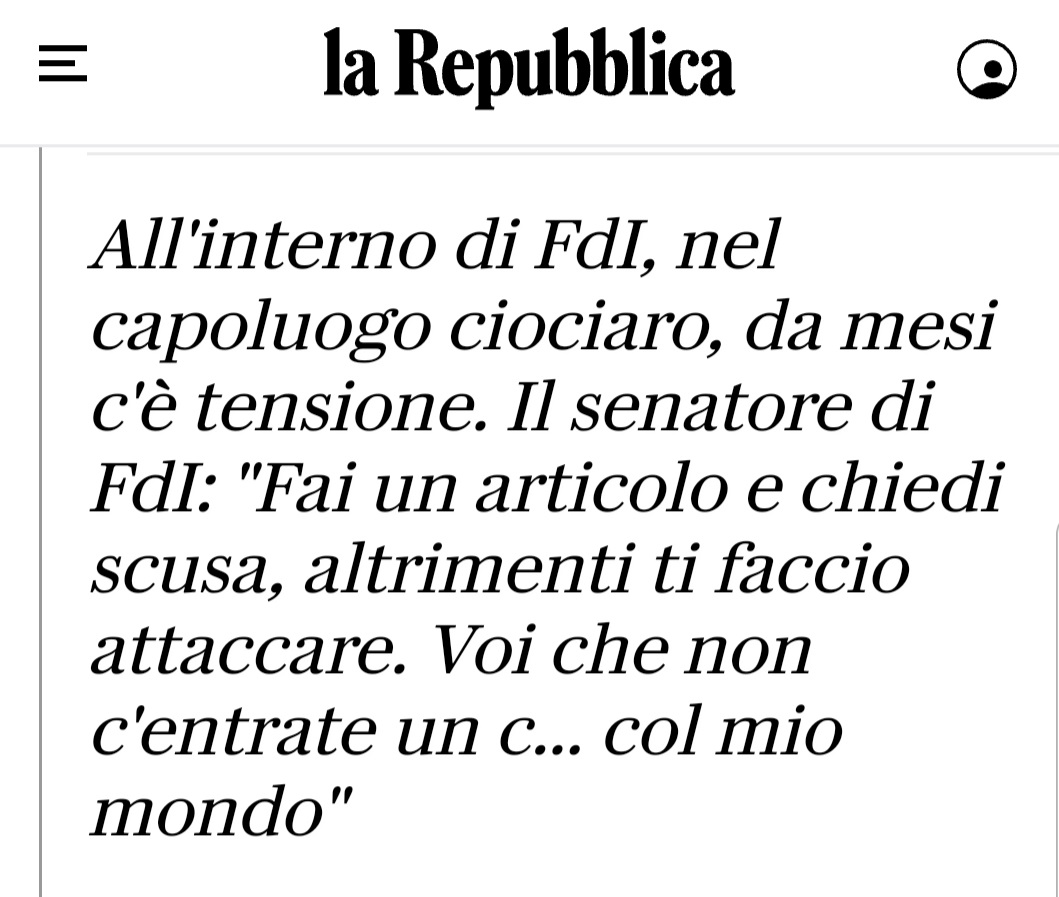 “Ho sentito la necessità di replicare ad un articolo, recentemente apparso sul quotidiano la Repubblica, nel quale viene ipotizzata una sorta di chiusura pregiudiziale verso chi non provenisse da esperienze politiche di destra, legata ad una visione nostalgica e addirittura neofascista, da parte della federazione provinciale di Fratelli d’Italia di Frosinone e, più in particolare, da parte del suo coordinatore e senatore Massimo Ruspandini.