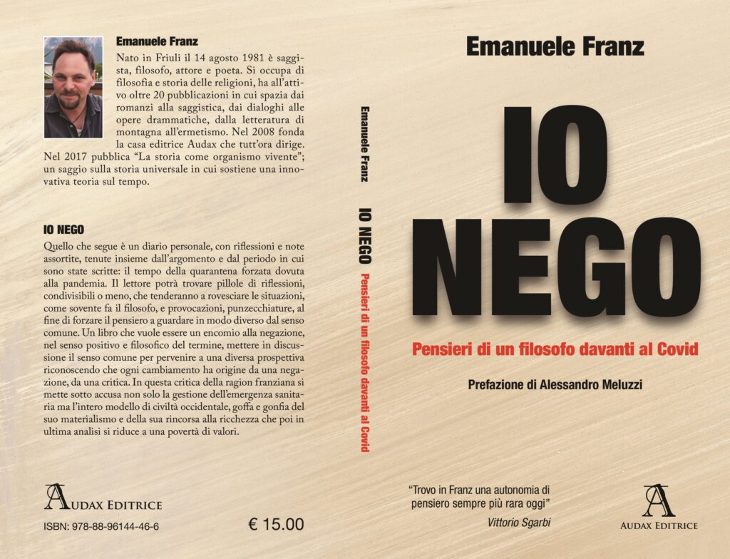 Tra i più attivi c’è Emanuele Franz con il suo nuovo testo “Io Nego”. Il libro è una raccolta di riflessioni, in chiave filosofica, di aforismi e aneddoti. Esso è dunque un diario personale, con riflessioni e note assortite, tenute insieme dall’argomento e dal periodo in cui sono state scritte: il tempo della quarantena forzata dovuta alla pandemia. Il lettore potrà trovare pillole di riflessioni, condivisibili o meno, che tenderanno a rovesciare le situazioni, come sovente fa il filosofo, e provocazioni, punzecchiature, al fine di forzare il pensiero a guardare in modo diverso dal senso comune. Un libro che vuole essere un encomio alla negazione, nel senso positivo e filosofico del termine, mettere in discussione il senso comune per pervenire a una diversa prospettiva riconoscendo che ogni cambiamento ha origine da una negazione, da una critica. In questa critica si mette sotto accusa non solo la gestione dell’emergenza sanitaria ma l’intero modello di civiltà occidentale, goffa e gonfia del suo materialismo e della sua rincorsa alla ricchezza che poi in ultima analisi si riduce a una povertà di valori.