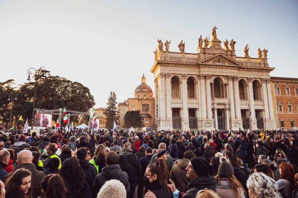 Nella piazza, come minimo 20 mila persone, c’era un po’ di tutto tra ex e militanti di estrema destra e di estrema sinistra insieme a famiglie, insegnanti, liberi professionisti e cittadini stanchi e impauriti dopo 2 anni folli. Ad un certo punto uno sparuto corteo improvvisato di chissà quale centro sociale minaccia di superare il cordone di polizia. Le forze dell’ordine nemmeno li prendono in considerazione, naturalmente Repubblica titolerà “Tensioni con la polizia, i fasci cercano di raggiungere Palazzo Chigi”.