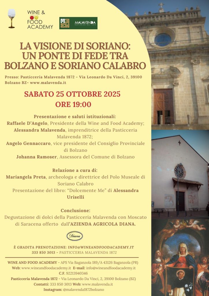 Sabato 25 ottobre 2025, alle ore 19:00, la Pasticceria Malavenda 1872 di Bolzano ospiterà un evento di grande valore culturale e simbolico, promosso dall’Associazione Wine and Food Academy APS: “La Visione di Soriano: un ponte di fede tra Bolzano e Soriano Calabro”. L’incontro nasce dal desiderio di celebrare il legame artistico e spirituale tra due comunità apparentemente lontane, ma unite da un’opera straordinaria, La Visione di Soriano, custodita nella Chiesa dei Domenicani di Bolzano e simbolo di una storia che attraversa secoli e territori.