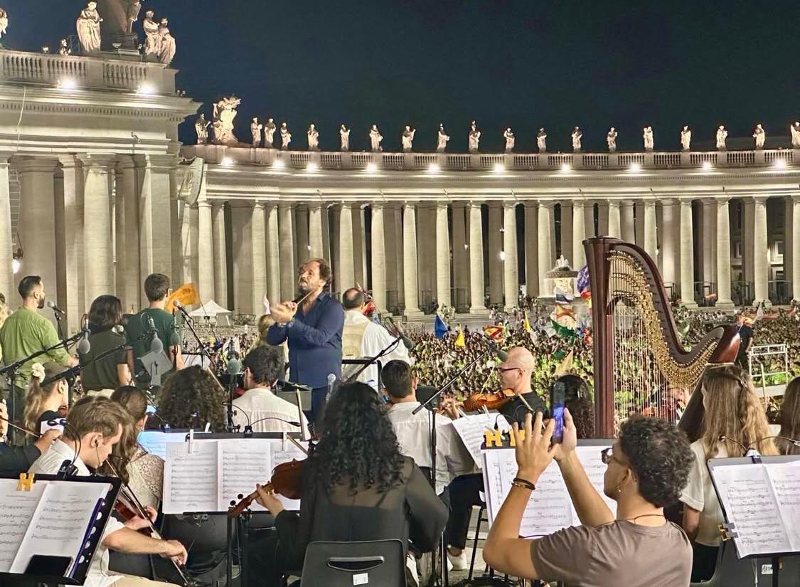 Come 25 anni fa, il Maestro Leonardo De Amicis ha diretto l’orchestra del Conservatorio per il Giubileo dei Giovani a San Pietro e a Tor Vergata. Simpatico, umano, estremamente attento all’ascolto dei giovani, nessuno meglio di lui avrebbe potuto investire quel ruolo, al seguito di ragazzi che vedono in lui un tramite fra la musica più raffinata e quella contemporanea. Giovanissimo Maestro esordiente in tv nel 1999 al fianco di Morandi in “C’era un ragazzo” (“Lo ricordo perfettamente, Gianni mi diceva che mi avrebbe coinvolto con battute e dialogando. Non avrei mai pensato potesse succedere veramente”), De Amicis è stato il direttore musicale del Festival di Sanremo nelle cinque edizioni di Amadeus (2020-2024), con cui collabora tuttora a Nove. Direttore artistico per L’Aquila città della cultura 2026, sarà alla direzione dell’orchestra sinfonica anche per il ricordo di un grande personaggio identitario: Luciano Pavarotti, oltre ai Cantieri dell’immaginario che lo vedono sempre al timone, così come la Perdonanza Celestiniana de L’Aquila (il 28 e 29 agosto).