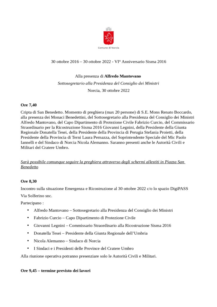 Domani domenica 30 ottobre in occasione della commemorazione del sesto anniversario del grave sisma che ha colpito la città nel 2016 il Sottosegretario alla Presidenza del Consiglio, Alfredo Mantovano, sarà a Norcia per la cerimonia che sarà guidata dall’Arcivescovo di Spoleto-Norcia, mons. Renato Boccardo, e si svolgerà nella cripta della Basilica ricostruita a partire dalle 7.40, orario della scossa di maggiore intensità. Saranno presenti il Sindaco di Norcia, Nicola Alemanno, il Commissario straordinario, Giovanni Legnini, e il Presidente della Giunta Regionale dell’Umbria, Donatella Tesei. Al termine della cerimonia, il Sottosegretario Mantovano incontrerà i Sindaci del cratere umbro presso lo Spazio DigiPASS in Via Solferino, per fare il punto della situazione sulla ricostruzione.