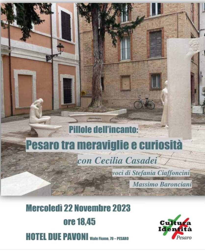 CulturaIdentità sezione di Pesaro ha di recente proposto un singolare evento recitativo all’Hotel Due Pavoni. “Pillole dell’incanto. Pesaro tra meraviglie e curiosità”. Una panoramica di impressioni e di note storiche per raccontare luoghi e opere di Pesaro attraverso lo sguardo di Cecilia Casadei: dalla celebre Medusa di Ferruccio Mengaroni che custodisce la tragica fine del suo autore ai tozzetti ceramici che disegnano un itinerario di cultura nel centro storico, da Villa Caprile, la piccola Versailles pesarese, alle luminarie che caratterizzano via Almerici, via Passeri e via Castelfidardo e celebrano la poesia dialettale, alla rinnovata Piazza Mosca e poi la berlina dei Conti Mosca. Un autentico gioiello dell‘arte antica come la Pala di Giovanni Bellini, il palazzo dell‘Economia Corporativa troppo spesso liquidato come architettura di regime senza comprenderne il valore, la “Sfera grande” di Arnaldo Pomodoro che tutti a Pesaro chiamano la Palla.
