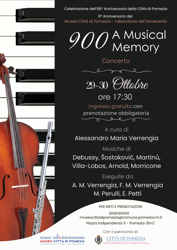 Patrocinato dal Comune di Pomezia, sostenuto dal Sindaco Veronica Felici e realizzato con la preziosa collaborazione del Dirigente del Settore II, Sabrina Bertozzi, ‘900 A Musical Memory è stato ideato e curato dal giovanissimo e talentuoso Alessandro Maria Verrengia, musicista del Conservatorio di Santa Cecilia, il cui profondo legame con Pomezia e con il Museo ha dato vita a questo progetto, pensato per rendere speciale omaggio all’occasione duplice delle ricorrenze cittadine.
