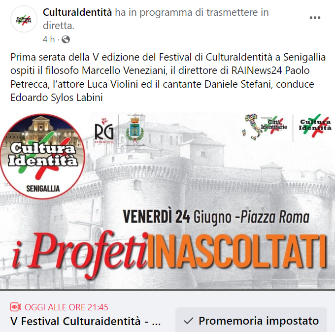 Questa sera dalle 21.45 in piazza Roma a Senigallia parte la V edizione del Festival di CulturaIdentità. La manifestazione, diretta ogni anno dall’attore Edoardo Sylos Labini direttore del mensile CulturaIdentità, si pone l’obbiettivo di raccontare le radici storiche, artistiche e culturali del Comune che ospita la kermesse, attraverso serate di spettacolo, incontri, premi, mostre e dibattiti con i più importanti personaggi della cultura italiana. Grandi nomi della cultura e dello spettacolo per raccontare l’identità della cittadina marchigiana: ospiti di Edoardo Sylos Labini saranno Marcello Veneziani, il direttore di RAINews24 Paolo Petrecca e il doppiatore Luca Violini, accompagnati dalla voce e dalla chitarra di Daniele Stefani. Sempre questa sera lo Spazio Visionaria inaugura la mostra I Profeti inascoltati del ‘900, a cura di Andrea Lombardi e Miriam Pastorino.