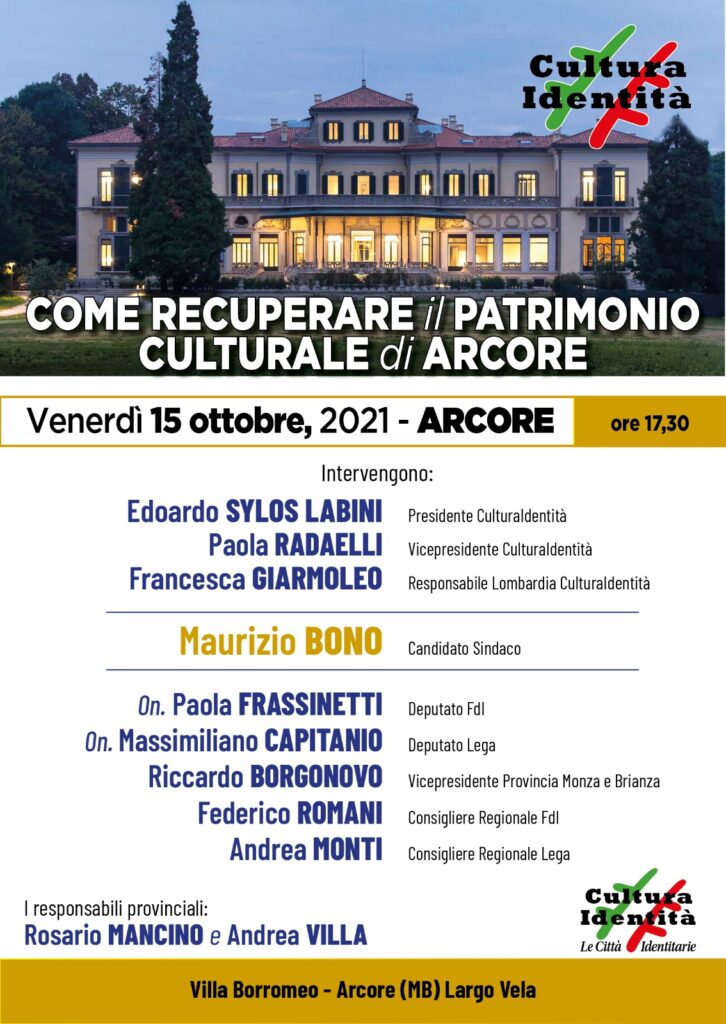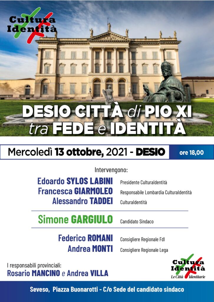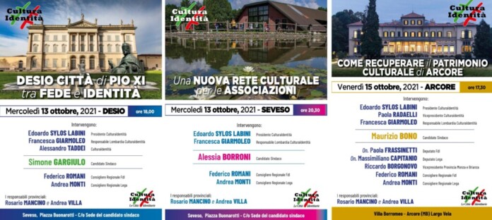 CulturaIdentità è da sempre alla difesa delle tradizioni culturali del territorio: questa settimana è la Brianza ad essere protagonista, con i tre appuntamenti organizzati da Francesca Giarmoleo, responsabile regionale di CulturaIdentità per la Lombardia, a sostegno dei tre candidati sindaci Simone Gargiulo (Desio), Alessia Borroni (Seveso), Maurizio Bono (Arcore). Sarà presente il Presidente di CulturaIdentità Edoardo Sylos Labini insieme a parlamentari e rappresentanti del Territorio.
