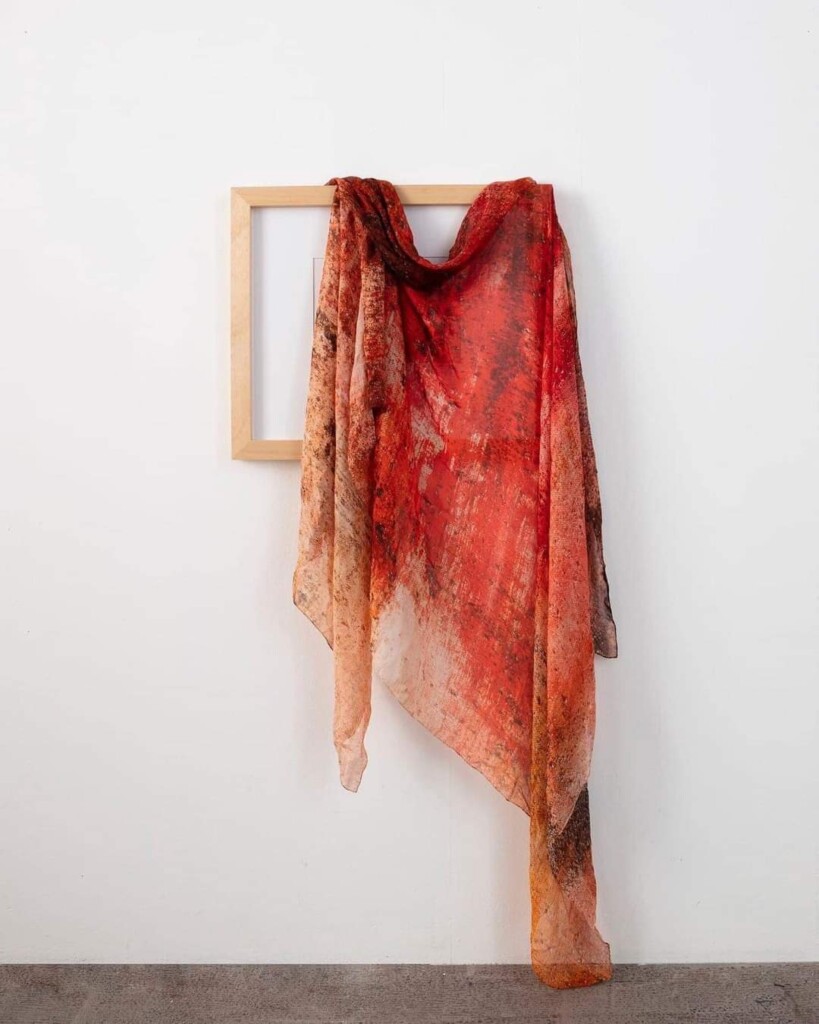 Un lavoro direttamente a contatto con la Natura, con il suo spirito e la sua essenza. Arianna Ellero lavora con e dentro la Natura realizzando delle opere informali legate al colore, ai pigmenti, alle terre e altri elementi assolutamente naturali. Le sue opere spesso provengono da azioni, da performance in cui si fa accompagnare e inspirare dalla musica. E’ come se la sua astrazione provenisse dai ritmi e dal colore delle note espresse in contemporanea dai musicisti. Le opere in seta esposte come drappi appoggiati a telai di legno, provengono da quadri realizzati nel 2016. Sono particolari, dettagli che diventano un Tutto in completa autonomia. L’idea del tessuto prezioso non è legato genericamente ad un elemento fashion che ormai siamo abituati a veder rappresentato nell’arte contemporanea. Sono invece memorie della propria famiglia di sarti. La madre in particolare riusciva a mettere insieme alta sartoria con la poesia. In effetti Arianna riprende una vocazione familiare, ma lo fa ripartendo da se stessa, dal bisogno di mettere insieme il sentimento della Natura con una partecipazione fisica all’opera d’arte. La forma è assenza, immaginario, spiritualità evocata dai pigmenti e dagli elementi naturali, come suggerimenti di una dimensione Altra.