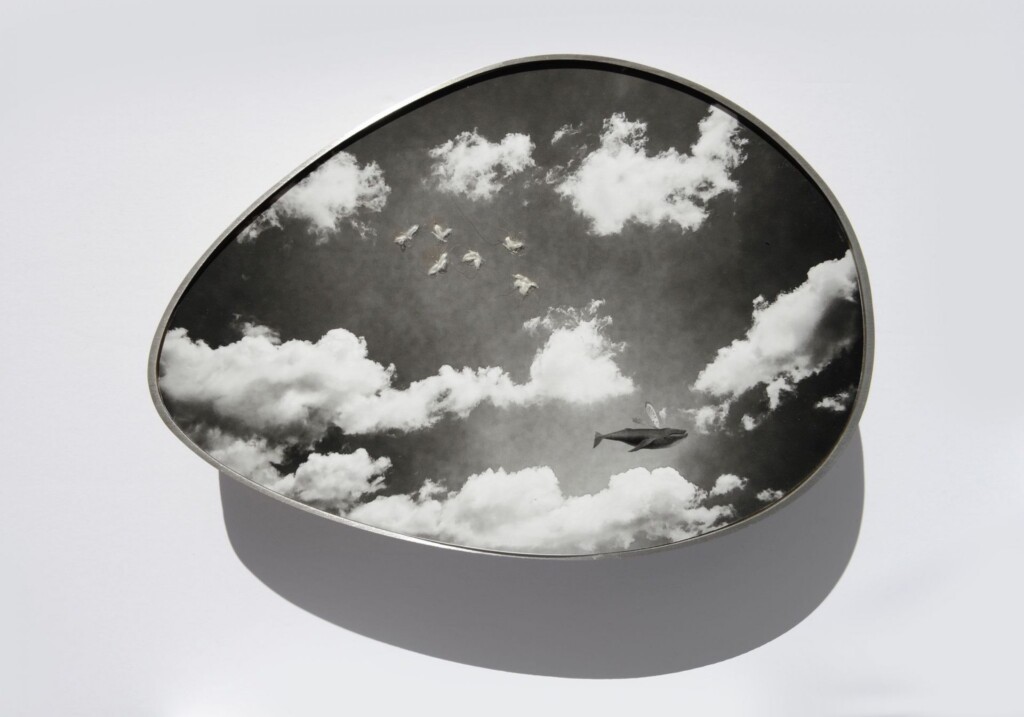 L’artista fa un uso estremamente importante della fotografia recuperandone la sua essenza soprattutto nel rapporto con la memoria e la presenza della realtà. Le immagini di orizzonti marini dialogano con la luce, la contengono ma anche ne vengono aumentate nella forma installativa. Il progetto “Luce” in fotografia, ricamo e foglia d’oro, apre delle possibilità poetiche nuove richiamando una dematerializzazione che sia l’oro che l’immagine evocano. Il concetto di rappresentazione non si attarda su valori descrittivi, suggerisce delle posizioni aperte, la fotografia ricorda un legame con la realtà fenomenica, ma questa si collega con un non visibile in un rapporto complesso e poetico nello stesso tempo. Beatrice Speranza miscela nei suoi lavori il bisogno di staccarsi dalla concretezza dei legami. Con “Esercizi di volo” il vuoto fotografico degli ampi spazi tra terra e cielo, viene reso ancora più leggero dalla struttura in legno che regge le immagini, stampate su carta cotone. Il ricamo è un segno di appartenenza, una forma di scrittura. Del resto la serie reca sul retro frammenti testuali del libro “Il poeta dell’aria” di Chicca Gagliardo.