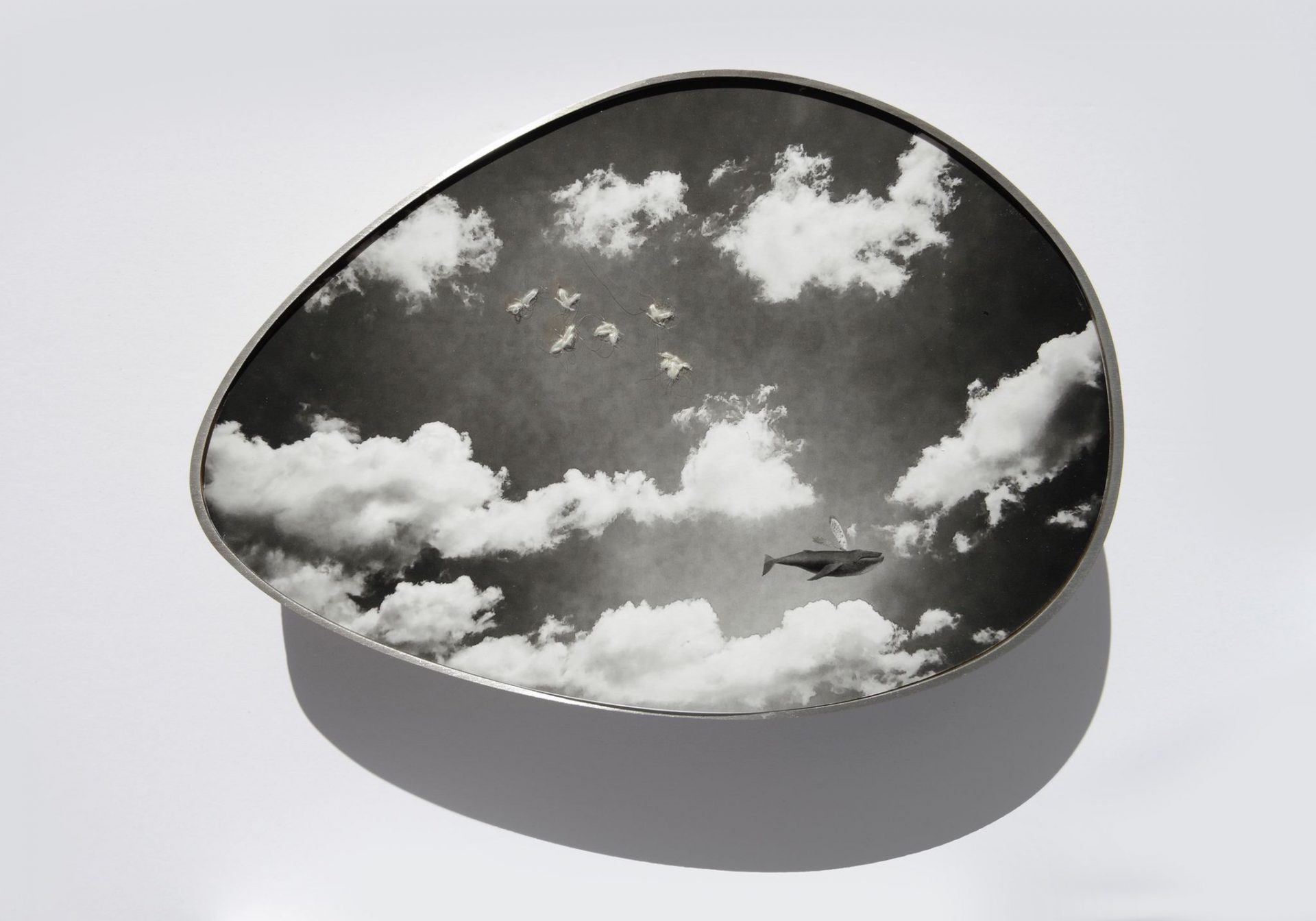 Beatrice Speranza “Esercizi di volo” – Stampa su carta cotone e ricami in filo di lana, Base in legno con profili in acciaio