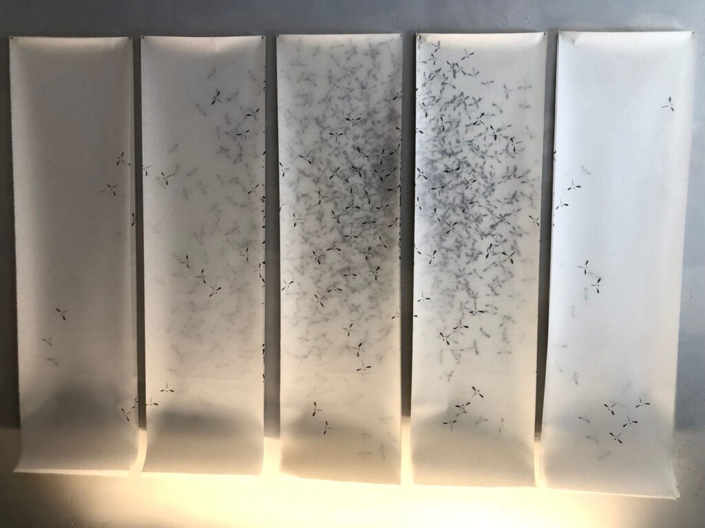 Le tele sembrano dei ricami sospesi nel tempo, costruzioni concrete di una realtà immateriale. L’artista materializza il tempo, vuole approfondire il legame tra il reale e il virtuale costruendo un linguaggio in cui l’antico e il futuro si saldano in una capsula del tempo. Sono disegni che richiamano elementi diversi dal decoro barocco all’architettura modernista, simboli di una lingua estetica nuova. La “scrittura” stesa con l’inchiostro giapponese richiama suoni visuali, quando interviene con il braille si aggiunge anche un elemento tattile. Il dolce panneggio accompagna questi lavori leggeri come un bisbiglio. Nella scultura “Ecosistema” le api finemente lavorate in marmo con le zampe di bronzo richiamano ad un presente possibile di collaborazione in cui la cultura diventa forza collettiva. Non a caso l’idea del volo come sintesi di un partecipare insieme alla costruzione della vita viene ripresa in “Aneurisma”, una grande installazione grafica che pervade lo spazio. Un lavoro fortemente simbolico sull’incapacità di avere una sintesi al fare comune, un invito alla collaborazione e coesistenza.